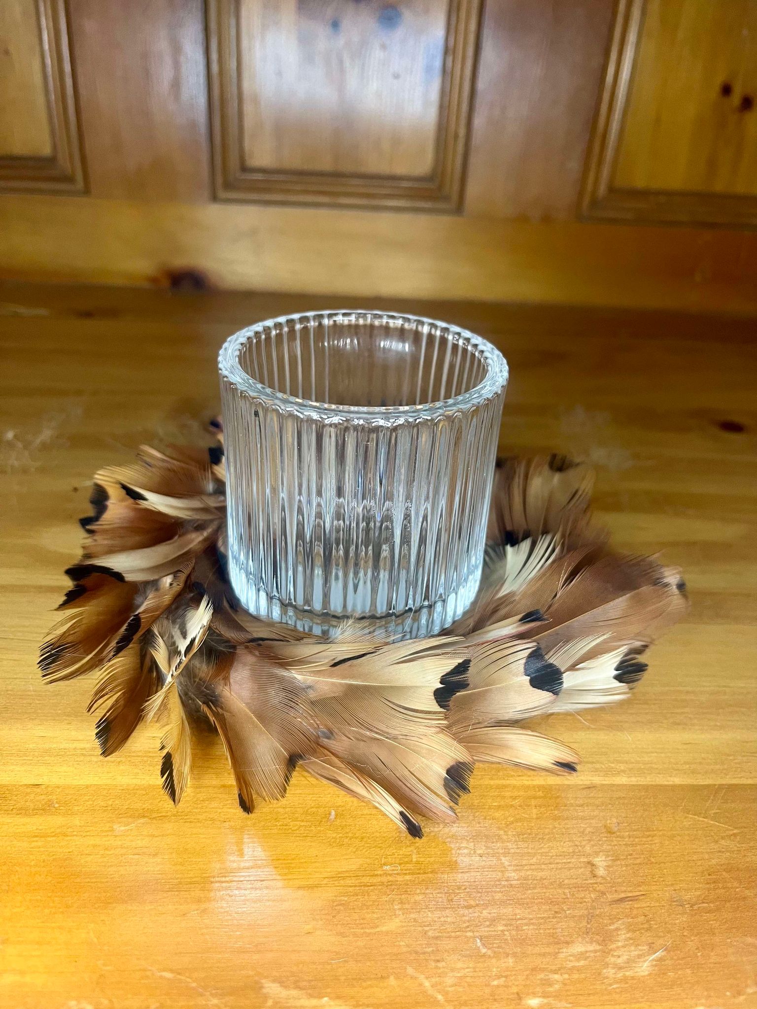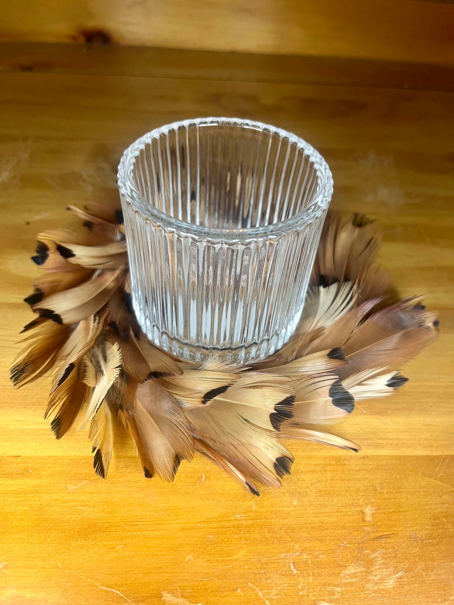 This Orange Pheasant feather candle holder Wreath is approximately 12cm wide and comes with the glass candle holder